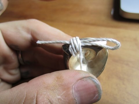 Continue wrapping snugly (but not tightly) until you reach the length of wrapped area you require. These weights have a small hole so I only wrapped one layer (make sure you don't fill up the area where your lobe is supposed to rest inside the body of the weight) but you could use thinner string and do multiple layers. Just make sure the end of your string ends up back on the loop end for the next step.
