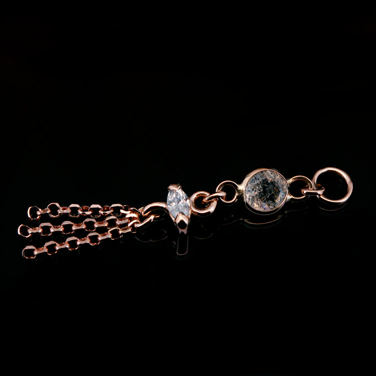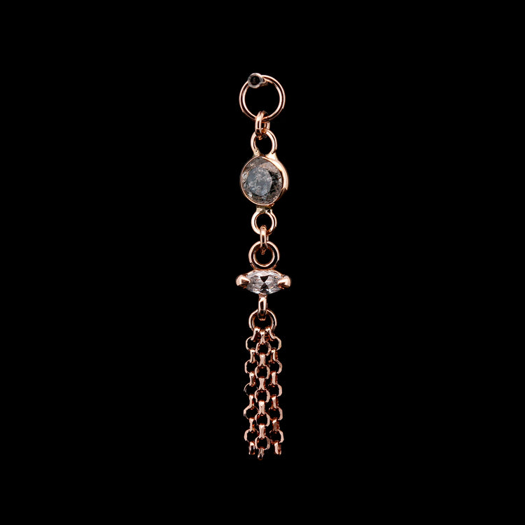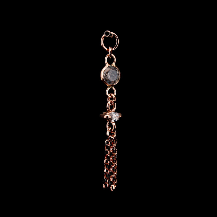 A delicate charm featuring a faceted Labradorite and sparkling CZ in 14kt Rose Gold with tassel accent.