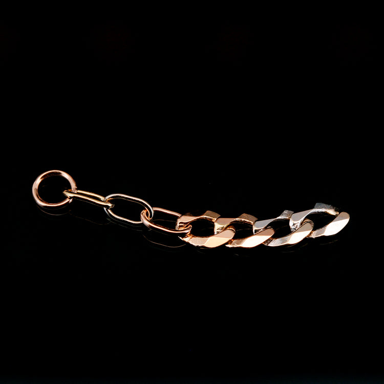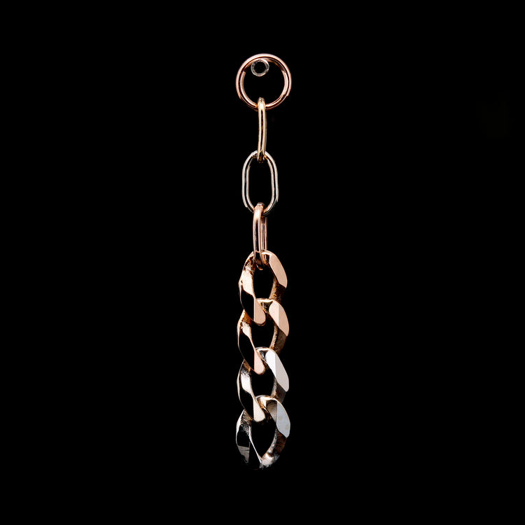 A segment of tri-color Cuban link style chain dangling below a segment of large link cable chain.