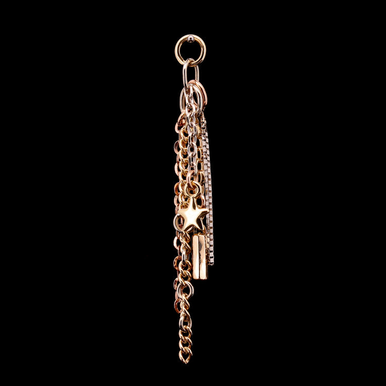 This awesome maximalist charm has everything! Five strands of mixed 14kt Yellow, Rose and White Gold chains in a variety of styles, as well as a star, a cylindrical bead, and different colored jump rings. It's a snug fit on 14ga jewelry, a looser fit on 16ga or smaller.