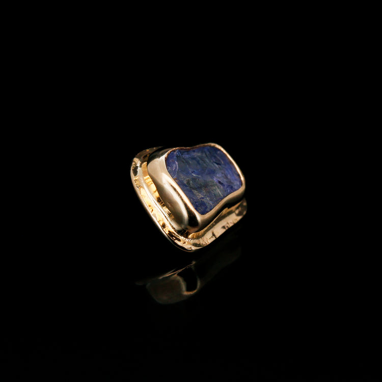 A uncut rough Tanzanite set in a Yellow Gold bezel.
