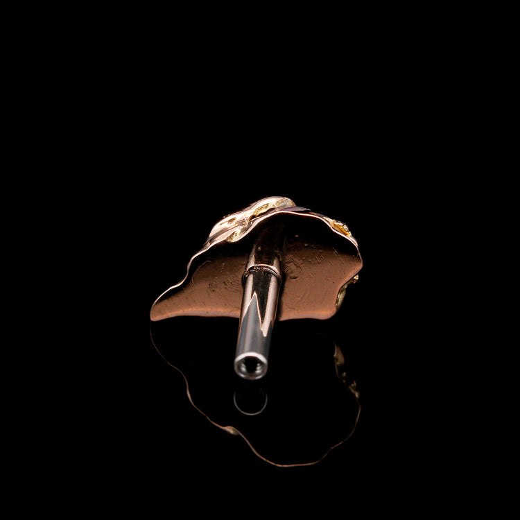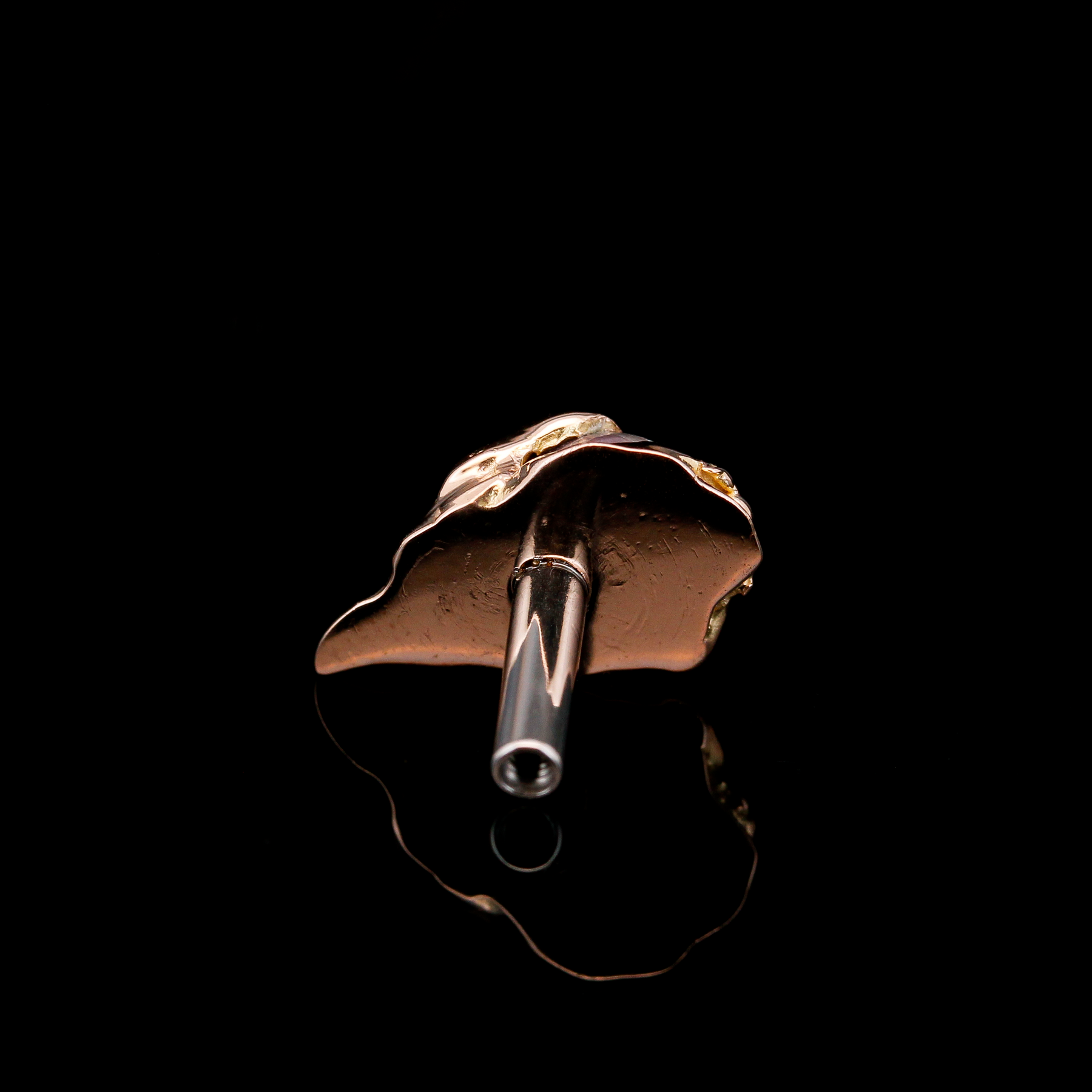 An organically formed teardrop shape crafted from 14kt Rose gold with curved thorn shapes wrapping around Charoite.