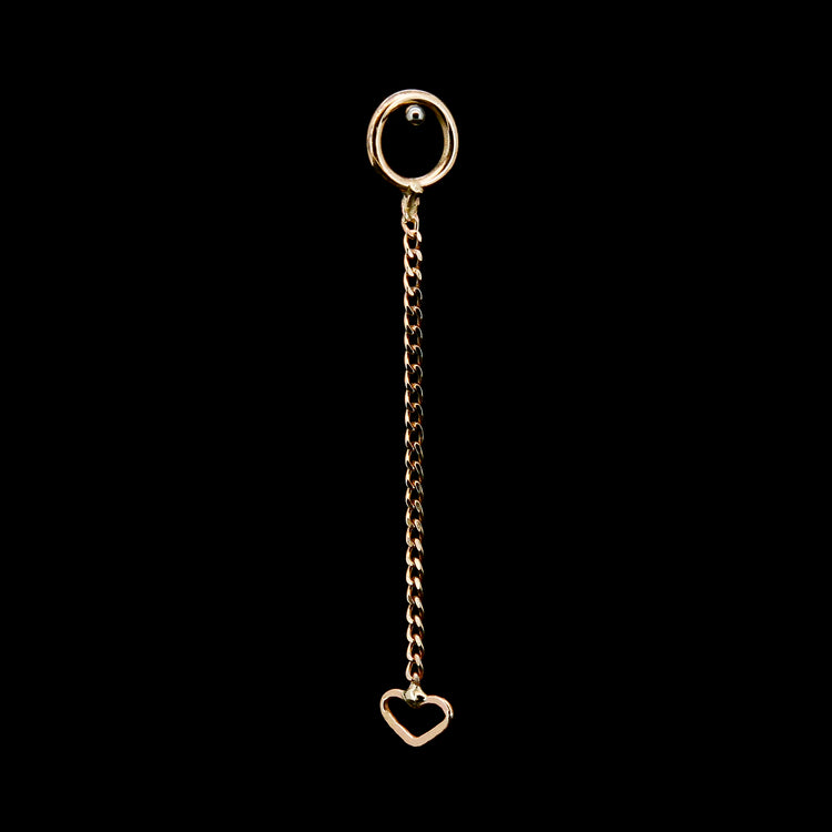 One delicate strand of Yellow Gold chain with a tiny heart at the end, suspended from a jump ring.
